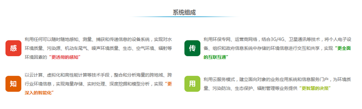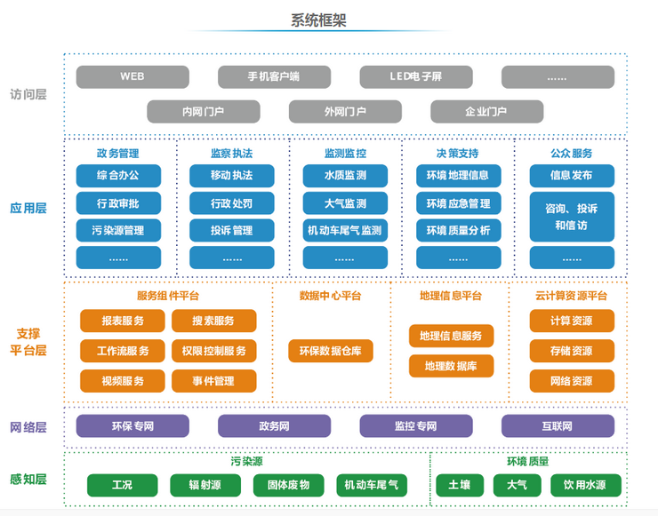 智慧環保系統采用先進的信息化手段,提供環保狀態感知、環保信息存儲、環保事件檢測、環保狀態評估及預測功能,以達到污染源控制、治理、消滅的目標。為環保政策制定、檢驗、評估、修正提供依據,并進一步探究環境問題成因的綜合性監測平臺。