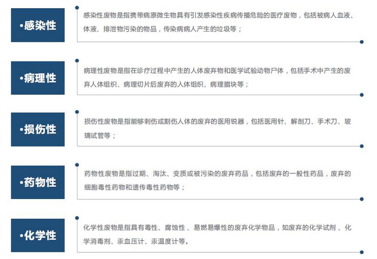 醫療廢物,是指醫療衛生機構在醫療、預防、保健以及其他相關活動中產生的具有直接或者間接感染性、毒性以及其他危害性的廢物。醫療廢物共分五類,并列入《國家危險廢物名錄》。醫療廢物是指在病人進行診斷、治療、護理等活動的過程中產生的廢物。醫療廢物中可能含有大量病原微生物和有害化學物質,甚至會有放射性和損傷性物質,因此醫療廢物是引起疾病傳播或相關公共衛生問題的重要危險性因素。