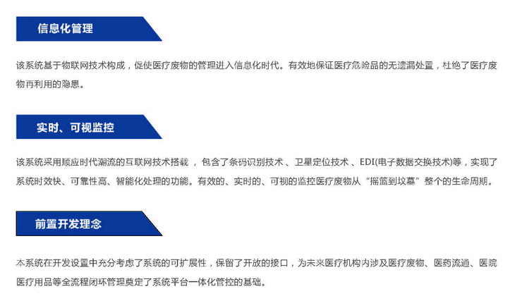 互聯網技術的發展使醫療廢物實時在線監管系統的建立成為可能,而服務和監管方式的新革命來自于條碼識別、射頻識別技術、衛星定位技術以及云計算和大數據的發展。以GPS技術結合移動互聯網技術實現可視化醫療廢物運輸管理和實時定位為基礎的高速、高效的信息網絡平臺和EDI(電子數據交換)等為骨干技術的“智慧型”醫療廢物管理系統,將為環保部門實現醫療廢物處理過程的全程在線監管提供了基礎的信息支持和保障。