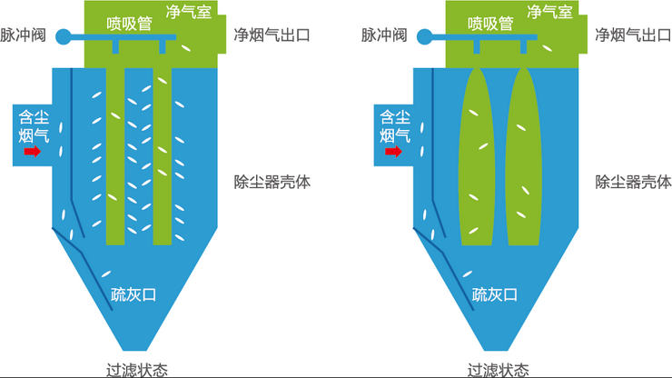 含塵煙氣通過過濾材料,塵粒被過濾下來,過濾材料捕集粗粒粉塵主要靠慣性碰撞作用,捕集細粒粉塵主要靠擴散和篩分作用。
