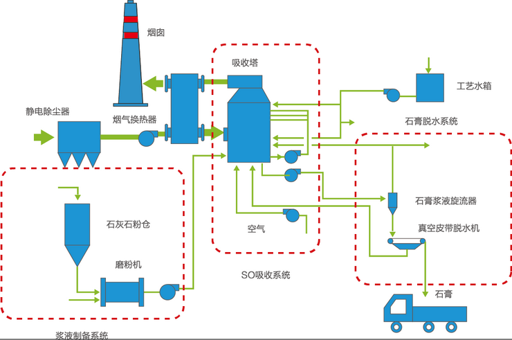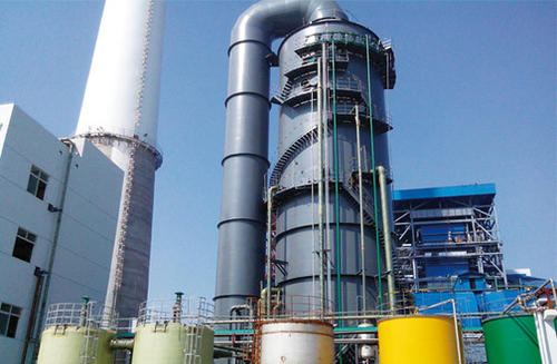 從除塵器出來的煙氣通過增壓風機,進入換熱器,煙氣被冷卻后進入吸塔,并與石灰石漿液混合。漿液中的部分水份蒸發掉,煙氣進一步冷卻。煙氣經循環石灰石稀漿的洗滌,可將煙氣中95%以上的硫脫除。同時還能將煙氣中近100%的氯化氫除去。在吸收器的頂部,煙氣穿過除霧器,除去懸浮水滴后經煙囪排放。