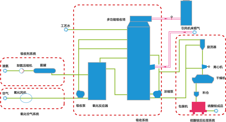 氨-肥法脫硫技術以液氨(氣氨)、(廢)氨水、碳銨、尿素等可以產生氨的堿性物質作為脫硫吸收劑,與洗滌后的煙氣發生反應產生亞硫酸銨,生成的亞硫酸銨溶液被鼓入的空氣強制氧化生成硫酸銨溶液,完成脫硫反應。硫酸銨溶液被原煙氣熱量濃縮、結晶,生成硫酸銨漿液(也可采用蒸發結晶工藝)。硫酸銨漿液通過結晶泵輸送至硫銨后處理系統,進行旋流、離心分離、干燥、包裝成袋裝成品。