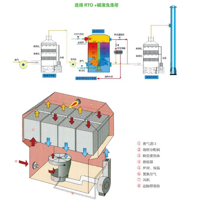 旋轉(zhuǎn)式RTO爐使用固定的熱交換媒介床,熱交換媒介使用的是蓄熱陶瓷。來自生產(chǎn)線的廢氣經(jīng)過熱陶瓷媒介床后被加熱;到爐膛后燃燒的高溫氣體將熱交換媒介床加熱,相對(duì)應(yīng)吹掃區(qū)、過渡區(qū)。在旋轉(zhuǎn)切換閥的作用下,陶瓷媒介床循環(huán)變化,如此兩組熱交換媒介床互相切換,蓄熱后去加熱低溫廢氣。因每次換向只有1/6陶瓷媒介改變氣流方向,故有效減小RTO進(jìn)出口的風(fēng)壓波動(dòng),對(duì)前端生產(chǎn)線氣壓影響很小,更適合涂布線。切換閥內(nèi)部設(shè)計(jì)吹掃風(fēng)道故分解率比塔式RTO更高,使有機(jī)廢氣分解率達(dá)到99%以上,最終使廢氣排放符合國(guó)家環(huán)保標(biāo)準(zhǔn)。熱交換效率達(dá)到95%以上,若有機(jī)廢氣濃度足夠,很容易實(shí)現(xiàn)氧化爐的自我維持,而不用添加燃料。處理量∶2500~20000mth。