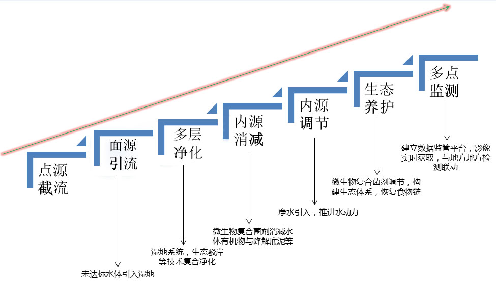 養:整治內源污染,通過微生物復合菌進行水體營養結構恢復,穩定或重建生態系統和食物鏈結構;