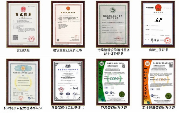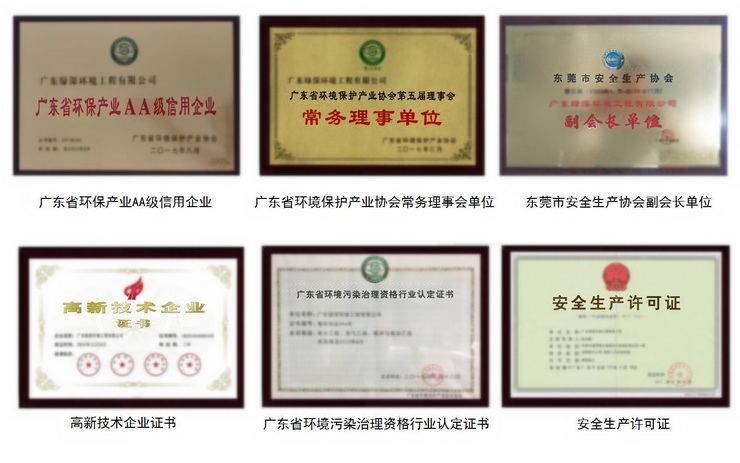 綠深環境擁有環保工程專業承包貳級資質、市政公用工程施工總承包叁級資質、建筑機電安裝工程專業承包三級資質、鋼結構工程專業承包三級資質,通過ISO9001質量管理體系認證、ISO14001環境管理體系認證以及GB/T28001職業健康安全管理體系認證,是廣東省高新技術企業,廣東省環保產業協會常務理事單位,東莞安全生產協會副會長單位。