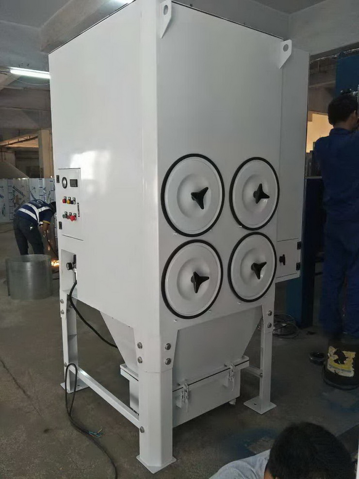 在離心風機負壓作用下含塵氣體從除塵器下方進入的機內,經過濾筒的高效過濾后,粉塵 被阻隔在濾筒的外壁,干凈的氣體經風機從設備頂部出風口排出,配有自動清灰裝置定時