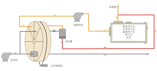 對于印刷行業廢氣,大部分為大風量、低濃度的有機廢氣,針對此類廢氣應首先對廢氣進行濃縮處理,將其轉變為小風量、高濃度的有機廢氣,然后再進入氧化設備進行焚燒處理,有機物轉變為二氧化碳和水后直接達標排放。