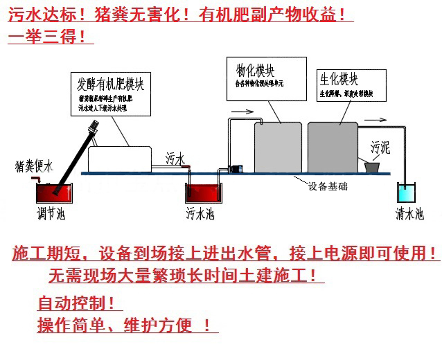 養豬廢水處理裝置是經過多年的實踐,逐步改進完善的一種專門針對遠離城市排污管網,又不宜在當地建設污水處理廠的地區,獨立的、一體化的,容易操作的養豬廢水處理裝置。處理原理是先將豬糞豬尿廢水粉碎后發酵,固體生產有機肥,廢液處理后達標排放。適用于養豬場。小型養豬廢水處理設備生化后級采用膜生物反應器(Membrane Bioreactor,簡稱MBR)技術是生物處理技術與膜分離技術相結合的一種新工藝,它可以高效地進行固液分離,得到直接使用的穩定中水。又可在生物池內維持高濃度的微生物量,工藝剩余污泥少,極有效地去除氨氮,出水懸浮物和濁度接近于零,出水中細菌和病毒被大幅度去除,能耗低,占地面積小。