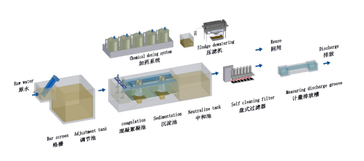 廢水由清洗線排放后經收集進入調節池,主要調節水質、水量。調節池出水經泵提升進入到反應池,由于該廢水中金屬離子較多(若金屬離子不足,可補充),通過反應池內投加氫氧化鈉,利用攪拌機攪動混合,使金屬離子與氫氧根離子反應生成難溶于水的金屬氫氧化物沉淀。反應池出水進入絮凝池,該池中投加一定的PAM,由于金屬氫氧化物沉淀為細小顆粒,PAM分子可與金屬氫氧化物沉淀微粒的互相連結形成粗大的絮凝團,使得絮凝團得以沉淀去除。沉淀池出水進入中和池,由泵提升進入自清洗過濾器進行處理。